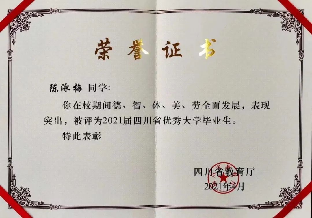 作者:陈泳梅,我校2015级小教4班校友,现就读成都师范学院小学教育专业本科,曾多次荣获国家励志奖学金、综合素质A级证书,被评为四川省优秀大学毕业生、优秀学生干部、优秀共青团干部等。